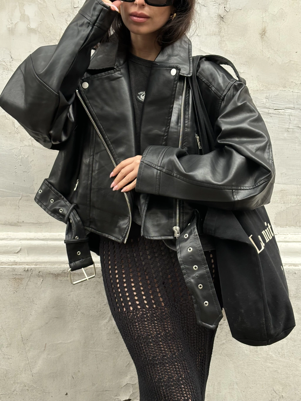 campera oversize, corta, de ecocuero color negro, con bolsillos reales, forreria y cinto.