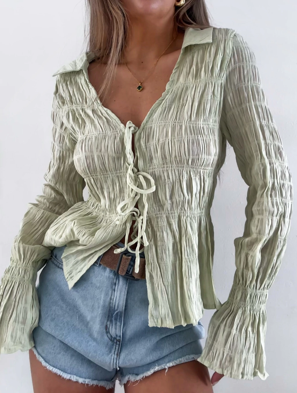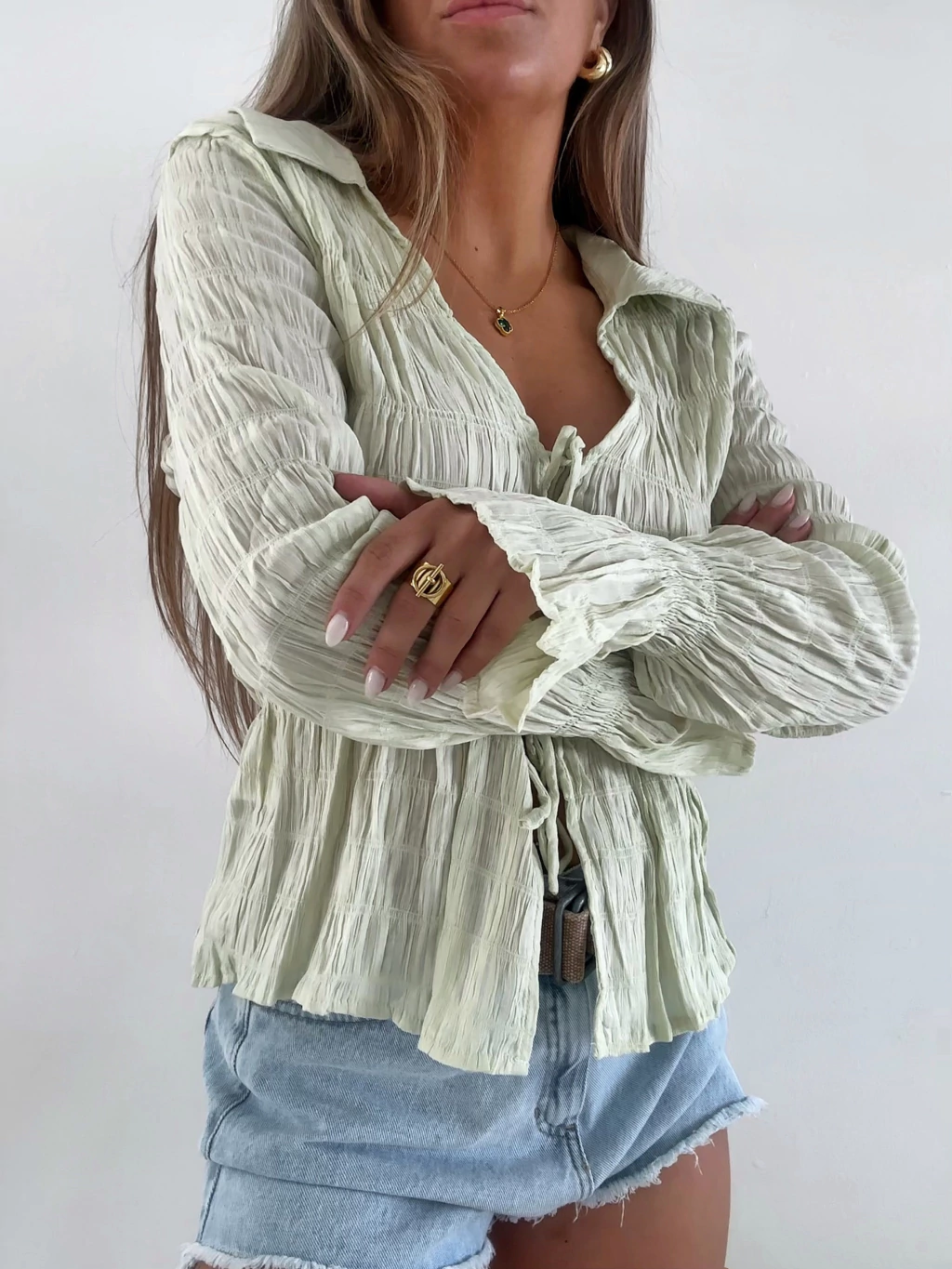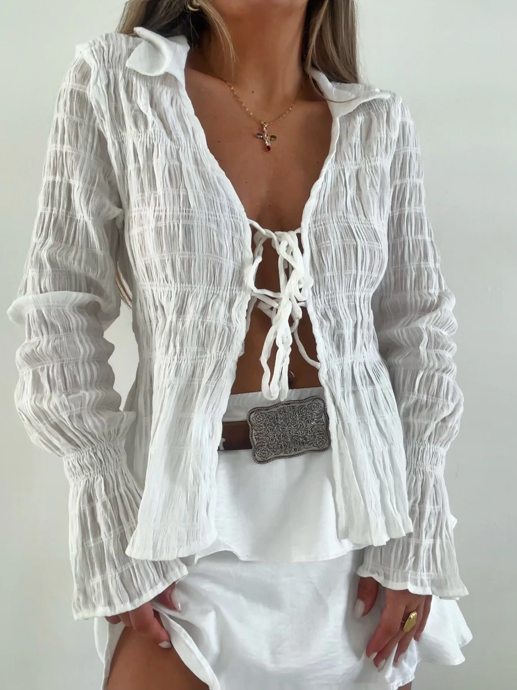 Blusa tipo camisa, manga larga, con tiritas en el frente para ajustar 🩷 te dejamos las medidas aproximadas acá abajo, tené en cuenta que son aproximadas y que fueron tomadas con la prenda apoyada. Lo ideal es que puedas tomar alguna prenda similar y compares las medidas apoyándolo en una superficie plana: