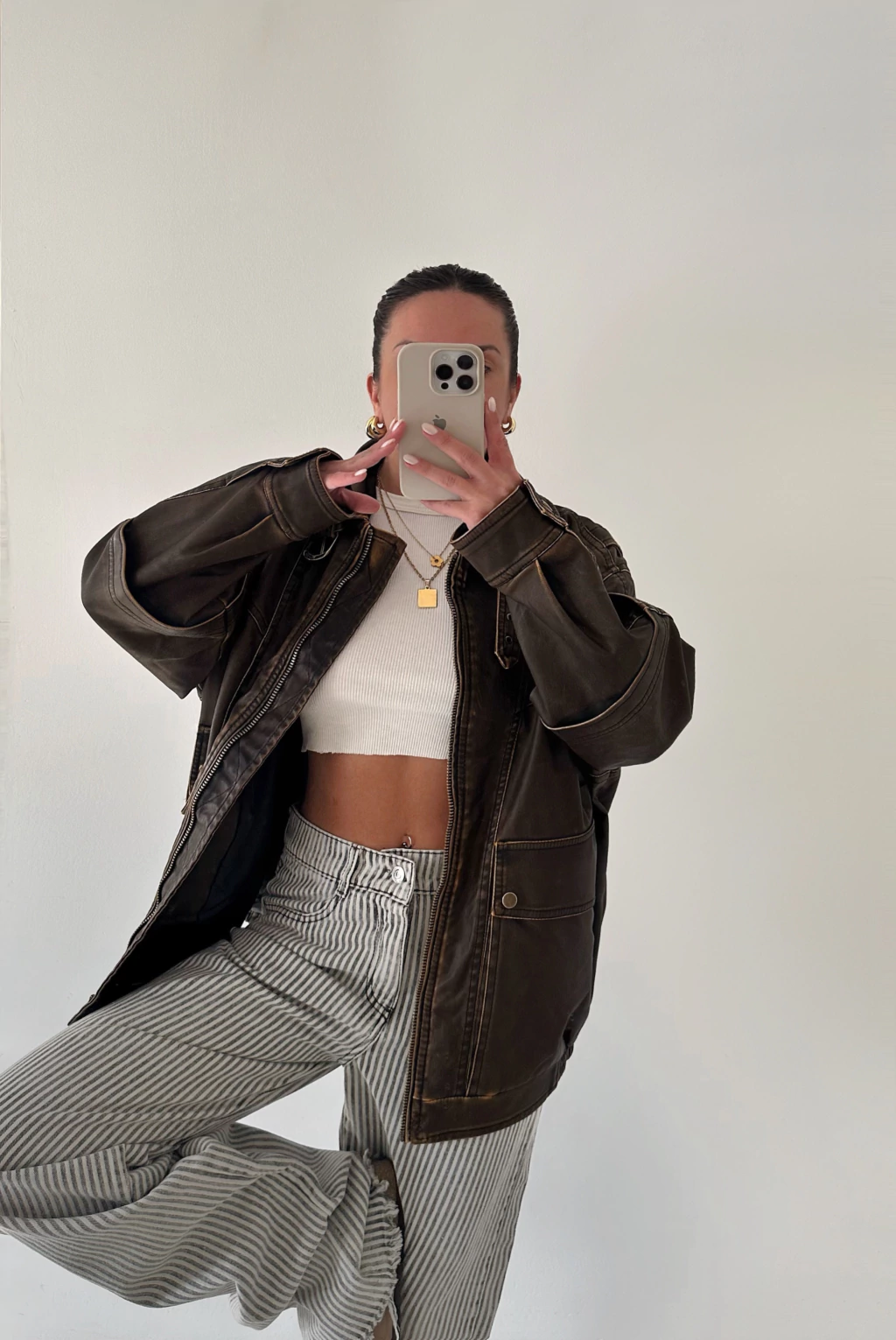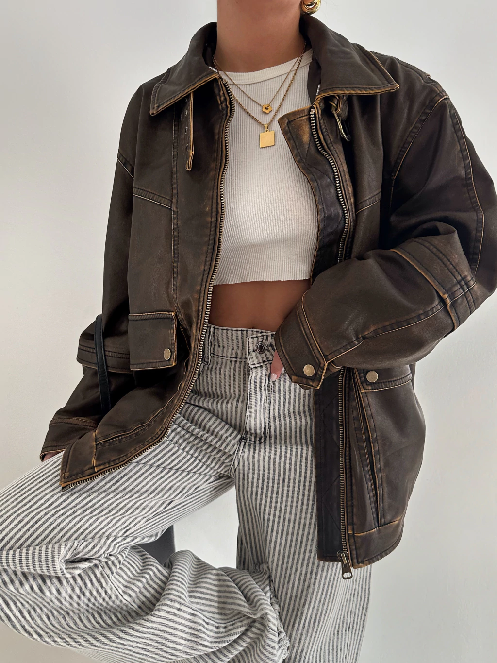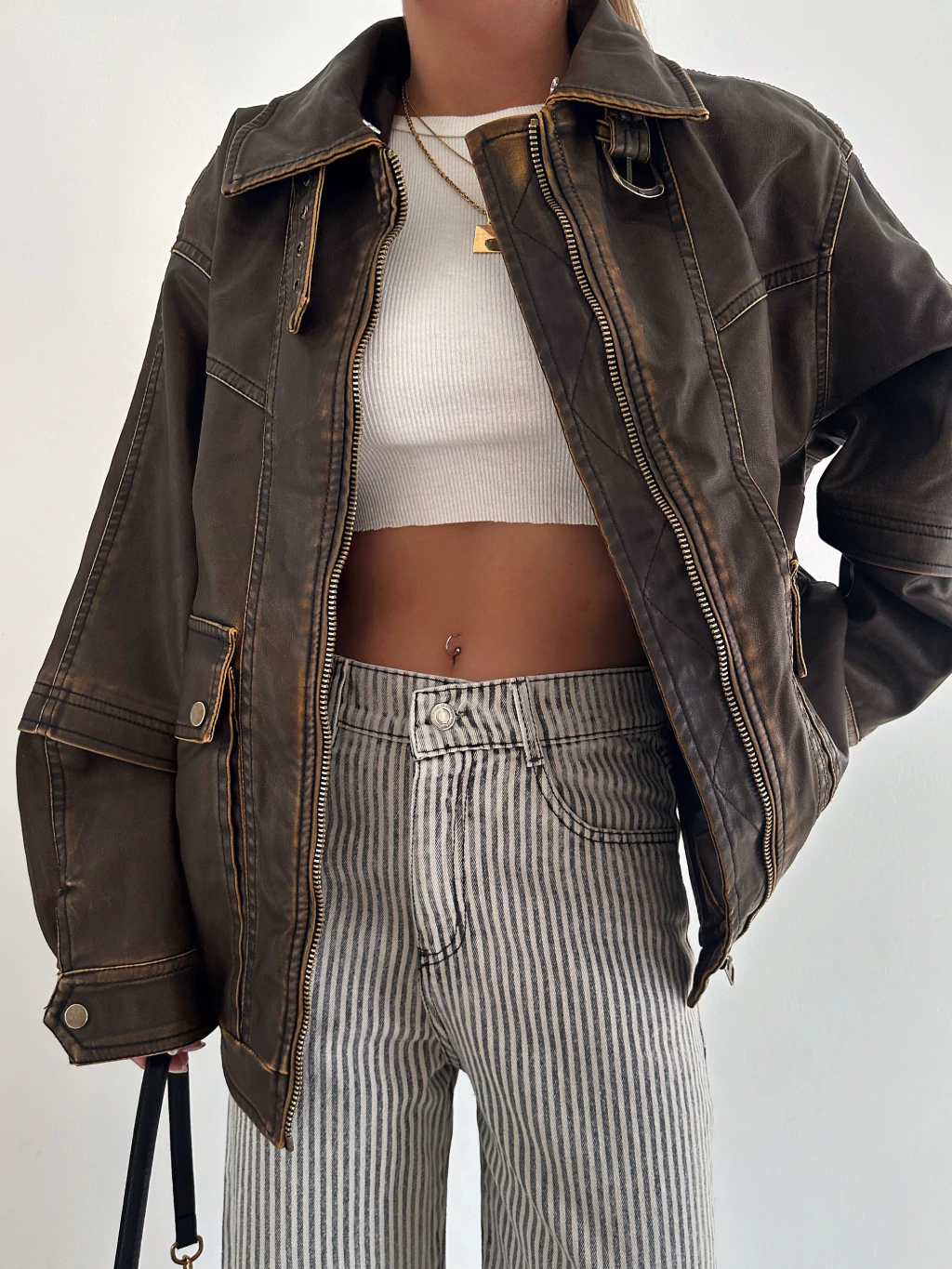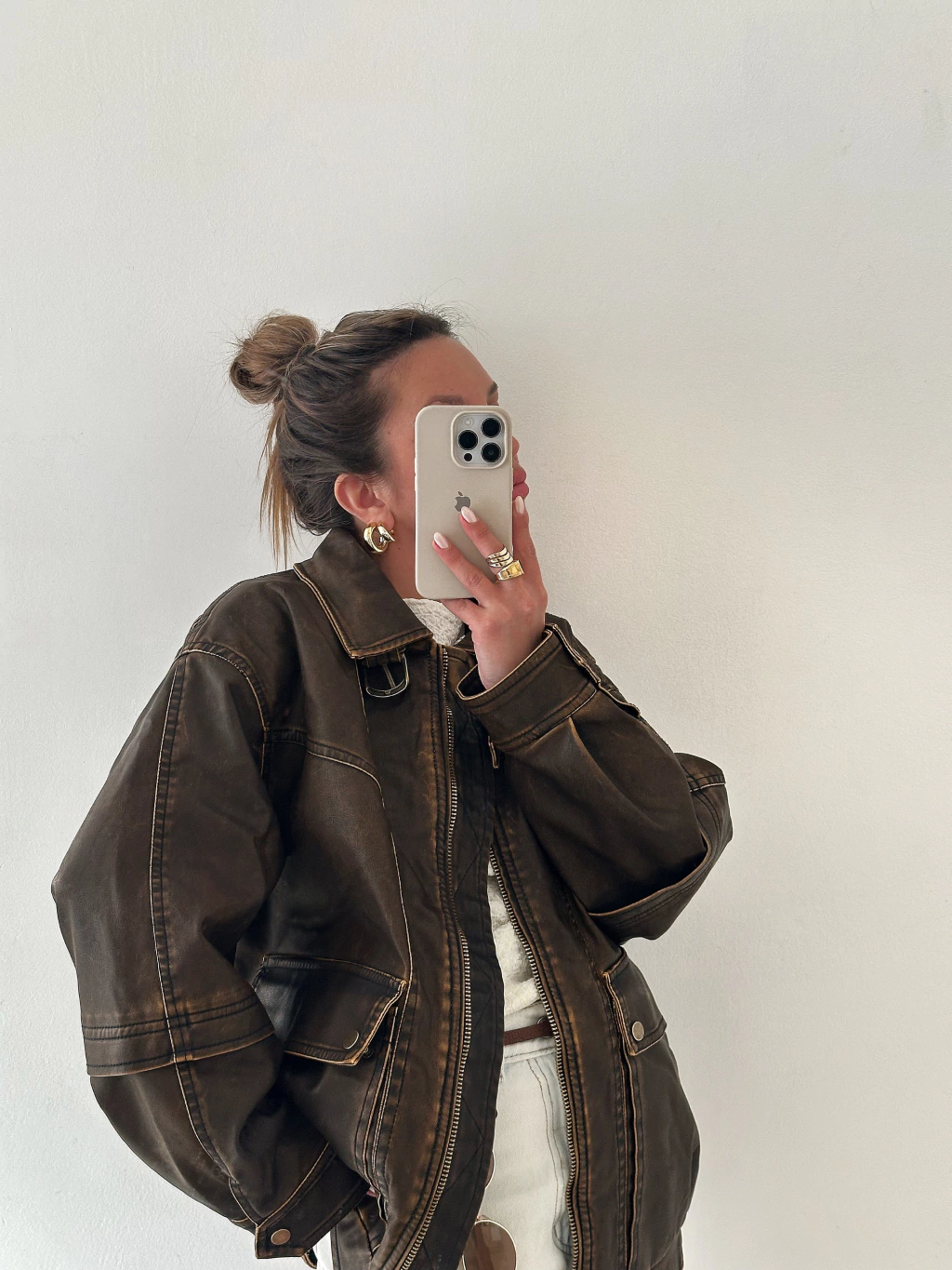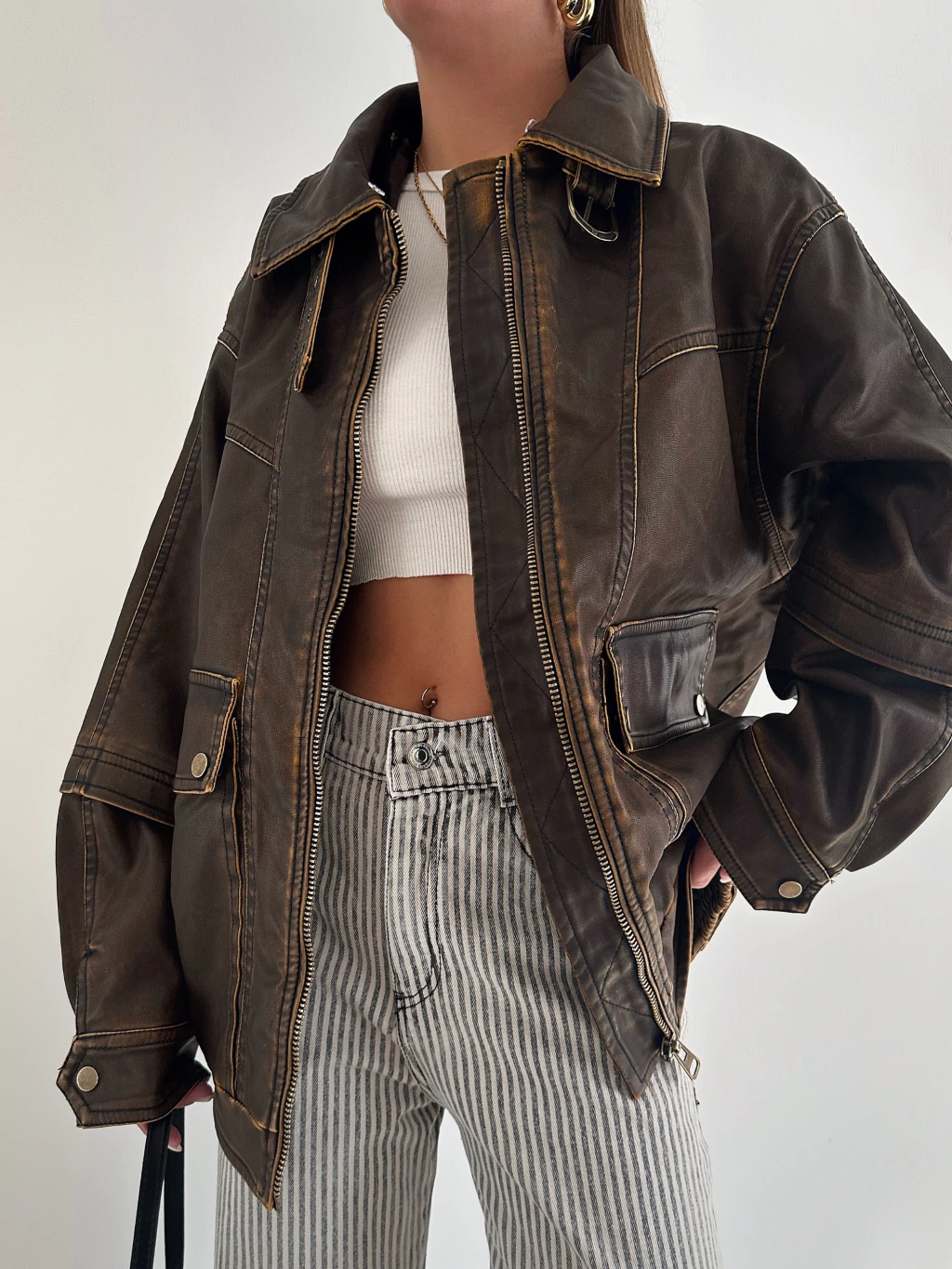 Campera color habano gastada, con herrajes color bronce, y peluchito desmontable en el cuello (en las fotos no lo tiene, pero tiene un peluchito color crudo que se le puede sacar en el cuello)