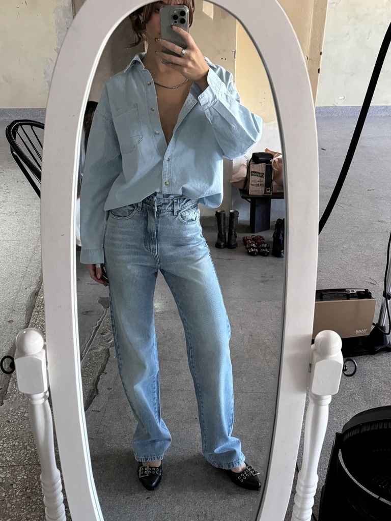 Jean rígido, color celeste tiro alto (si lo querés usar más tiro bajo, recomendamos llevar un talle más), con botón, cierre y bolsillos reales delanteros y traseros. El corte del pantalón es STRAIGHT, así que es un corte más recto (no es wide leg) y cuanto más alta seas, más recto te va a quedar. Tené en cuenta que Flor siempre es talle small/36 de pantalón, mide 1,55mts (tuvo que cortar el largo) y está usando el talle 36.